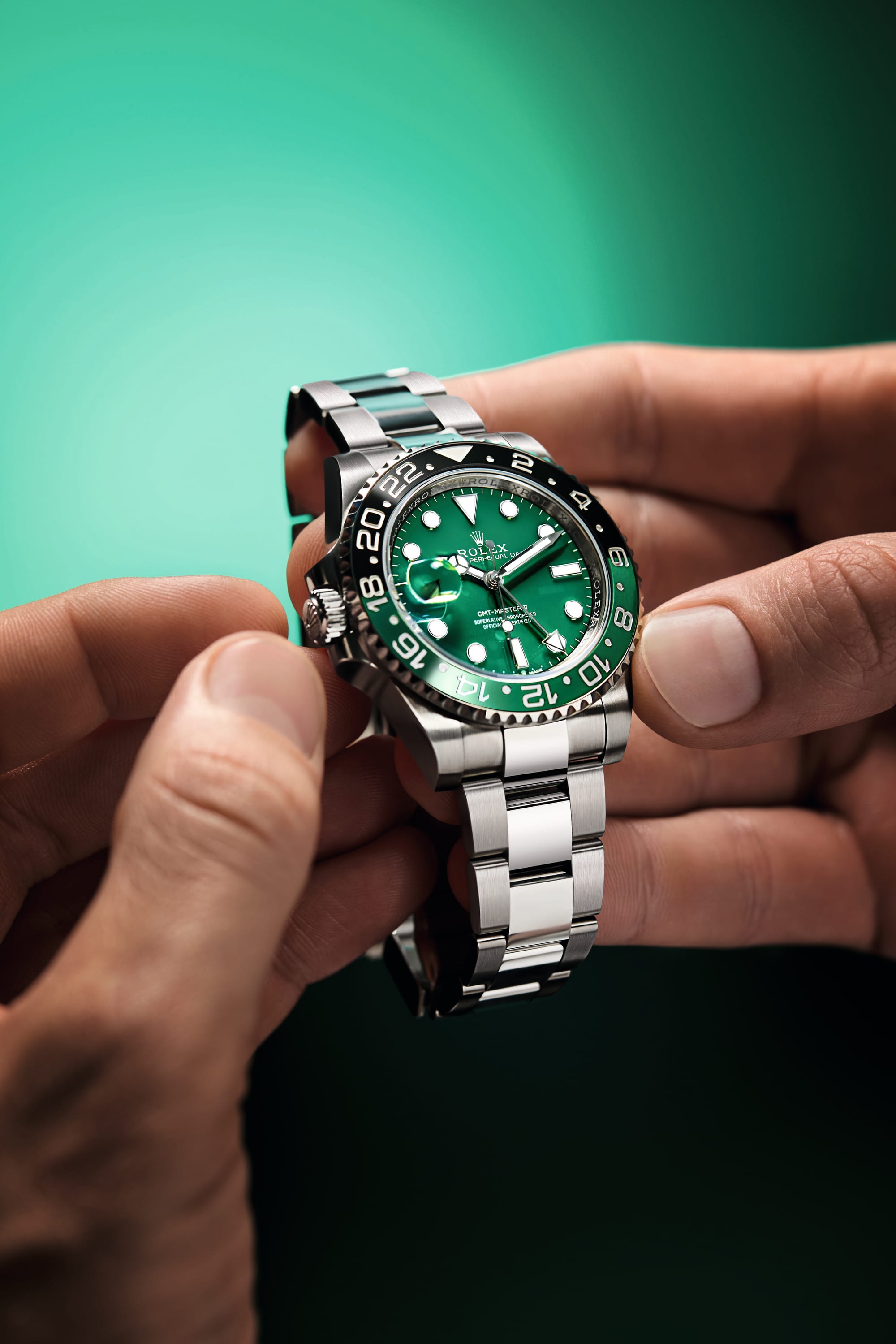 By matching the green ceramic dial with the green-and-black Cerachrom bezel, Rolex achieves a visual and technical continuity between the display and the case — a unique hallmark of this new GMT-Master II. The entire composition demonstrates the precision and skill required to produce ceramic components in perfectly calibrated colours.